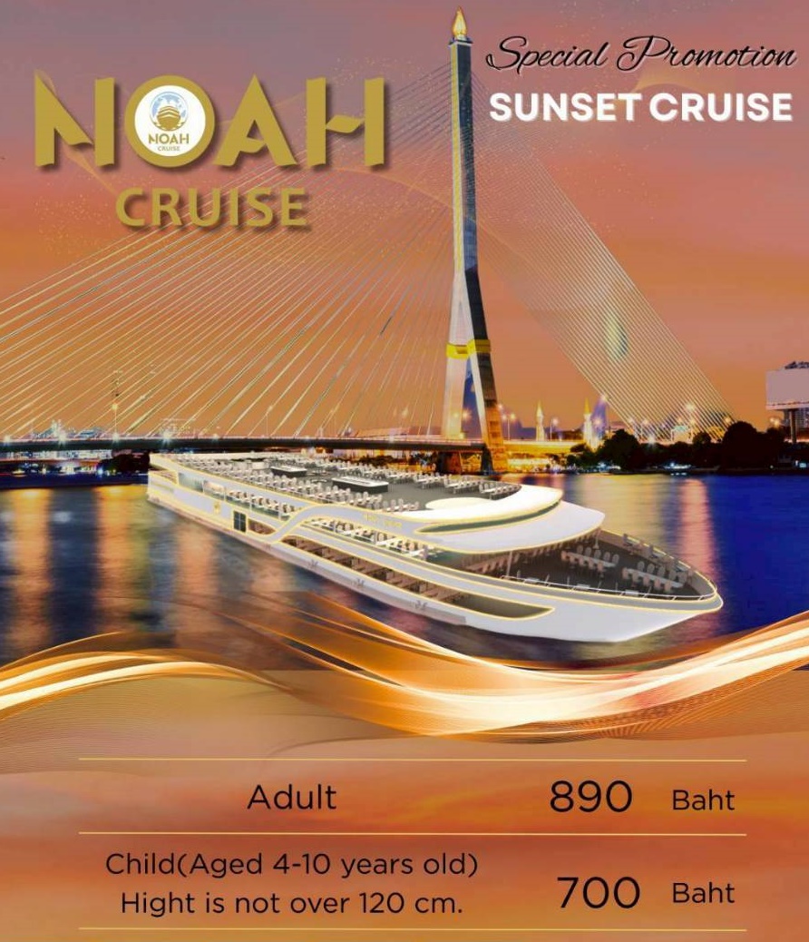 ล่องเจ้าพระยาดินเนอร์ บัตรราคาพิเศษ เรือโนอาห์ NOAH CRUISE เรือดินเนอร์ลำใหญ่ 3 ชั้นตกแต่งสุดหรู ชั้น 1 และ ชั้น 2 เป็นห้องแอร์เย็นฉ่ำ หน้าต่างกระจกบานใหญ่ มองเห็นวิวชัด ชั้น 3 (ดาดฟ้า) เป็นโซน open air รับลมธรรมชาติ มองเห็นวิว 360 องศา และมีห้องวีไอพีสำหรับความเป็นส่วนตัว รองรับในวาระอันสำคัญของท่าน พร้อมพาคุณล่องแม่น้ำเจ้าพระยา อิ่มเอมกับอาหารชั้นเลิศ วิวเมืองยาม ค่ำคืน สัมผัสมื้อค่ำสุดหรูพร้อมบุฟเฟ่ต์และดนตรีสด พร้อมวิวแลนด์มาร์ค สวย ๆ ของกรุงเทพฯ เส้นทางการล่องเรือที่ผ่านจุดสำคัญมากมายของกรุงเทพฯ ระหว่างทาง ท่านจะได้สัมผัส บรรยากาศวิถีชีวิตริมแม่น้ำ และสถานที่สำคัญทางประวัติศาสตร์น่าสนใจ ที่อยู่สองฝั่งแม่น้ำ เป็นอีกหนึ่งประสบการณ์ที่น่าประทับใจสำหรับช่วงเวลาพิเศษของท่าน ดื่มด่ำกับทัศนียภาพอันตระการตาของแม่น้ำเจ้าพระยา อันเปรียบเสมือนเส้นเลือดหล่อเลี้ยงวิถีชีวิต ของชาวไทยมาแต่โบราณกาล พร้อมอิ่มอร่อยกับบุฟเฟ่ต์อาหารไทยและอาหารนานาชาติกว่า 30 รายการ ล้วนแล้วแต่เป็นเมนูยอดนิยม ไม่ว่าจะเป็น ซูชิ ซาชิมิ อาหารทะเล อาหารมังสวิรัติ ขนมไทย ขนมเค้ก ผลไม้ประจำฤดูกาล รวมถึงชาและกาแฟ เสิร์ฟค่ำคืนแห่งความประทับใจ และบรรยากาศสุดโรแมนติก ที่คุณจะไม่มีวันลืม 1. โปรแกรมล่องเรือรอบดูอาทิตย์ตก (Sunset) ราคาโปรโมชั่น ผู้ใหญ่ 890.- (ปกติ 1,500.-) เด็ก (4-10 ปี) 700.- (ปกติ 1,000.-) *จอง 2 ท่านขึ้นไป มีส่วนลด* ![]() ![]() 2. โปรแกรมล่องเรือดินเนอร์ดูแสงสีค่ำคืน Dinner ราคาโปรโมชั่น